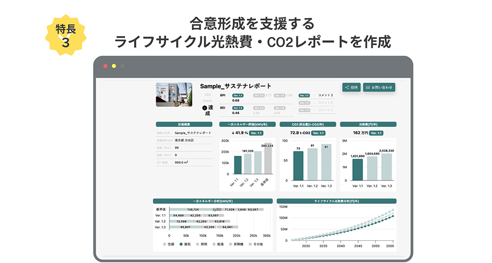 設計初期からライフサイクルで環境負荷やコストのシミュレーションが可能。設計案ごとの省エネ計算結果に基づき、一次エネルギー、電気・ガス・油の複数熱源に対応したライフサイクル光熱費・CO2排出量の推移をグラフや数値で可視化します。グラフ表示されている数値のバックデータをExcelでダウンロードし、自社の施工費などを参照した投資回収シミュレーションなどに活用することも可能です。
