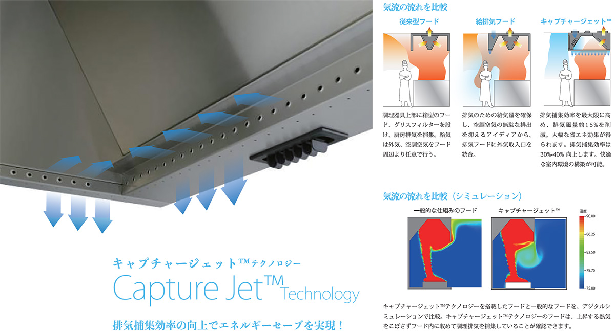 キャプチャージェット™テクノロジーは、調理のための大きな開口を確保しながら、拡散する煙や臭いを高い捕集効率で誘引し、快適な調理空間を実現します。