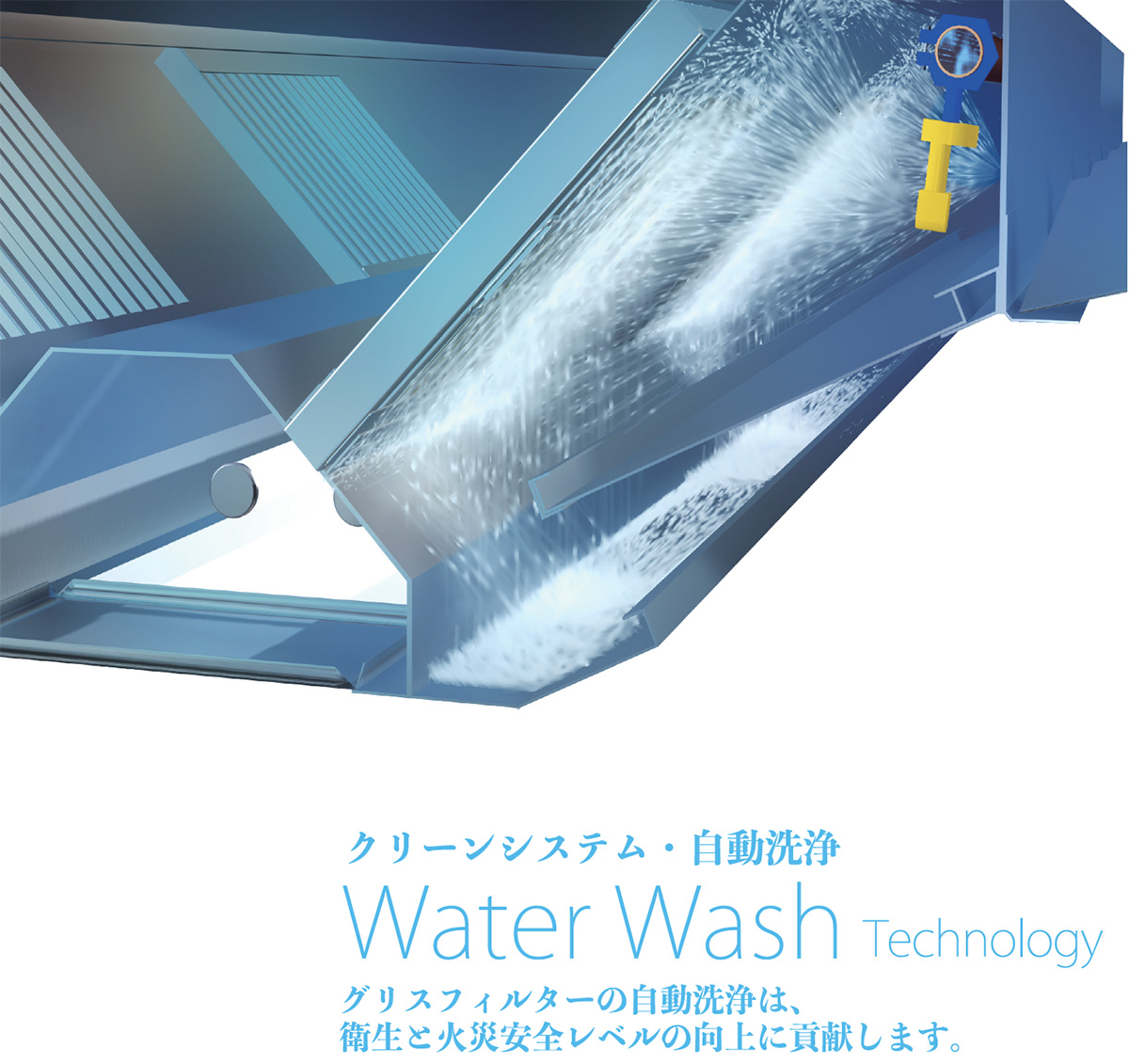 クリーンシステム・自動洗浄機能のフードは、密閉・防水されており、内部には、効率的にフィルターを洗浄するためにスプレーノズルがセットされています。調理室壁面に設置されたコントロールパネルによるスケジューリング機能で、洗浄時間設定、洗浄の残量などが確認できます。自動洗浄は、衛生面、安全性を向上させ、既定の清掃にかかる清掃こすとが軽減できます。