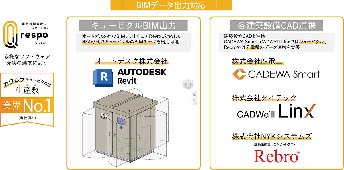 これからさらに需要が高まっていくBIMに対応しています。クレスポで作図の際、BIMデータ出力欄にチェックすると、オートデスク社のBIMソフトウェア”Revit(レビット)”に対応したキュービクルのBIMデータ(RFA形式)を出力することが可能です。また、建築設備CADのCADEWA(キャデワ)、Rebro(レブロ)、CADWe’ll Linx(キャドウィル リンクス)と連携をしており、それぞれのCADソフトウェアの特性を活かした連携となっています。今後も建設業界の働き方改革に貢献できるようそれぞれのCADソフトウェアとの連携強化を図っていきます。