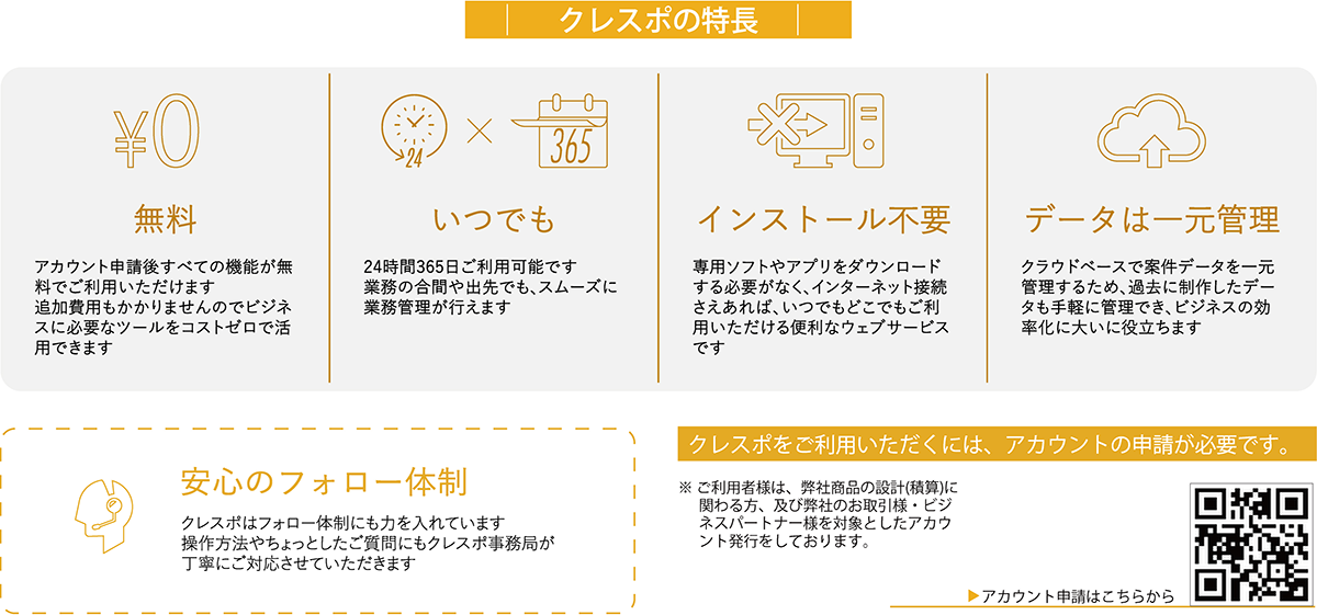 クレスポは会員登録制のウェブブラウザサービスです。専用のソフトやアプリのインストールは一切不要で、ネットが使える環境であれば24時間365日いつでもご利用いただけます。また、案件はクラウドデータでの一元管理なので、過去に制作したデータの管理も簡単です。