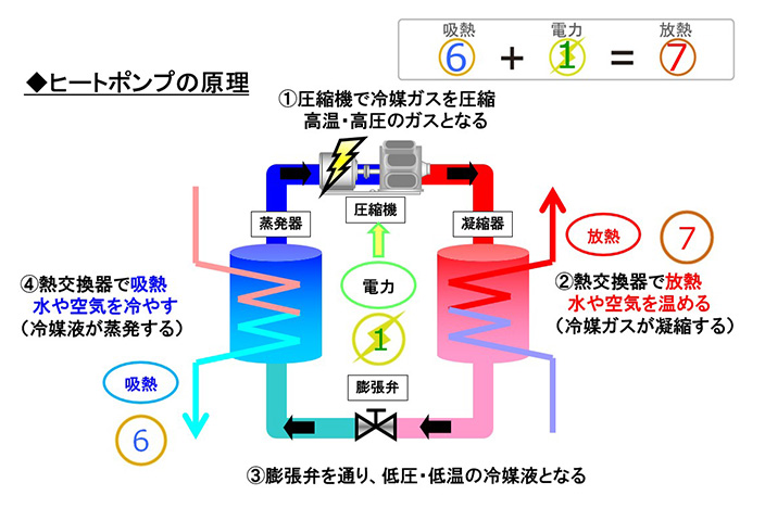 ヒートポンプは水と冷媒を熱交換するサイクルの下、冷温熱を効率良く生成する省エネアイテムとして注目されている。サイクルとして①冷媒が圧縮機で圧縮され高温高圧の冷媒ガスへ変化②凝縮器(熱交換器)で冷媒と水が熱交換し水は昇温③冷媒が膨張弁を通過し低温低圧の冷媒液へ変化④蒸発器(熱交換器)で冷媒と水が熱交換し水は冷却。このヒートポンプサイクルを通し、冷水ならびに温水を生成する熱源機器である。その最大の特徴は1の投入エネルギーに対して何倍もの冷却、加熱エネルギーを得られる点である。