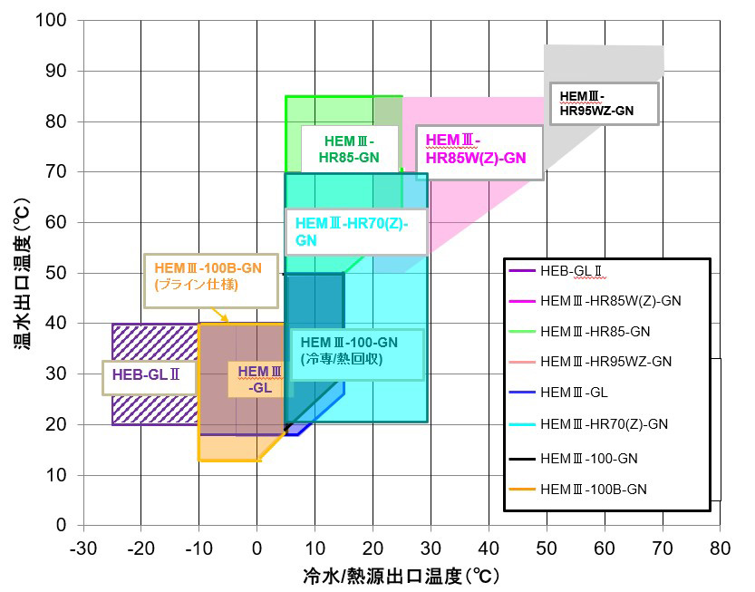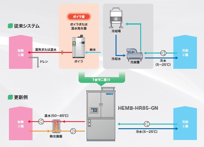 上記の冷媒規制を受け、各熱源機器メーカーは指定製品毎に設定された目標GWPを達成する冷媒を採用した熱源機器を目標年度までに開発・リリースすることを推進している。コベルコ・コンプレッサは従来より熱回収ヒートポンプ(冷温水同時取り出し型・廃熱回収型)を数多くラインナップし、「脱炭素」をキーワードに空調のみならず産業プロセスへの適用を進めてきた。この熱回収ヒートポンプに採用されていた冷媒は代替フロン冷媒であり、上記冷媒規制にかかるものであったが、至近では冷媒転換を行い、ノンフロン冷媒・低GWP冷媒を採用した熱回収ヒートポンプを続々とリリースしている。一般的な空調で使用される5℃~15℃の冷水と15℃~50℃の温水を同時供給可能な「HEMⅢシリーズ(ノンフロン冷媒・低GWP冷媒採用)」、「5℃~30℃の冷水と20℃~70℃の温水を同時供給可能なHEMⅢ-HR70-GN」、「5℃~50℃の冷水と50℃~85℃の温水を同時供給可能なHEMⅢ-HR85(W)-GN」等、冷温水ともに広範囲をカバーでき、多岐に亘る業種・プロセスに適用できる熱回収ヒートポンプをラインナップ。