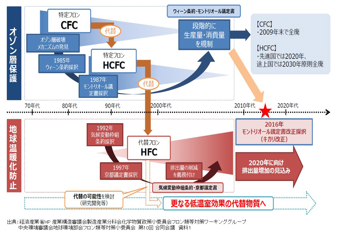 一方で、ヒートポンプサイクルの中で使用される冷媒について、一定量のフロンが含まれることから、環境影響を踏まえ、冷媒使用を規制する法改正が進んでいる。1987年にモントリオールにおいてオゾン層破壊物質の生産、消費量の削減を義務付けたモントリオール議定書が採択され、特定フロンに規制がかかった。その後、2018年にモントリオール議定書がルワンダのキガリにて改正され、代替フロンが規制対象に。日本を含む先進国は、2036年までに実に基準値の85%もの代替フロン削減を課されている。国内ではこの法改正を背景とし、 フロン排出抑制法に基づく指定製品制度が導入され、フロン類使用製品(指定製品)の製造・輸入業者に対して、出荷する製品区分毎に、環境影響度(GWP)低減の目標値・目標年度を定め、事業者毎に出荷台数による加重平均で目標の達成を求めている。