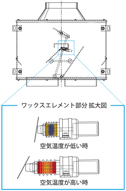 ワックスエレメントが空気温度に応じて伸び縮み→伸縮に合わせて羽根の向きを変え空気の出口を切替え(騒音や振動の発生無く切替可能)