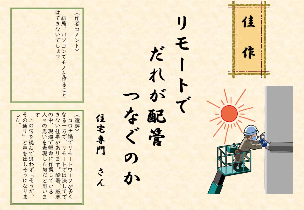 ニュース 第1回 建築設備あるある川柳コンテストの結果発表 2021.06.01 第1回 建築設備あるある川柳コンテストの各賞が決定いたしました。 最優秀賞1句、優秀賞3句、佳作5句、特別賞1句を選出いたしました。 ご応募いただいた皆様、誠にありがとうございました。 (一社)建築設備技術者協会 関東支部 イラストレーター:木村 佳世子 2021年建築設備情報年鑑「病院建築」竣工設備データ... 新型コロナウイルス感染症対策に関する緊急事態宣言等、...