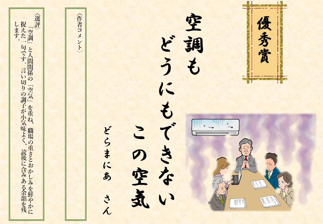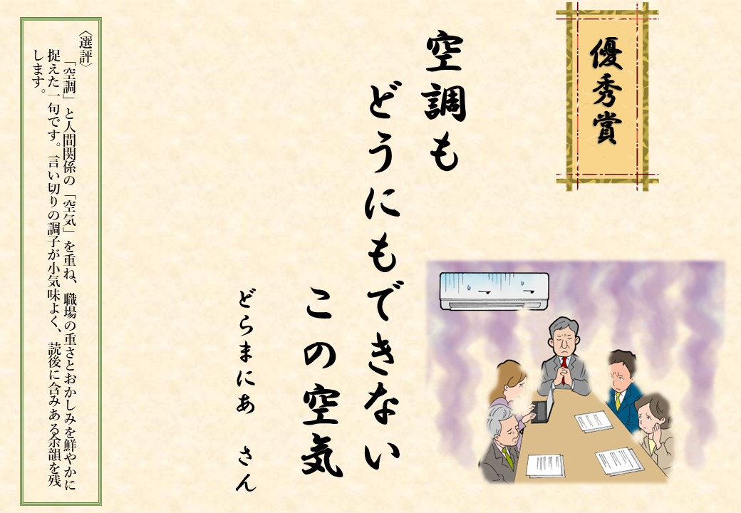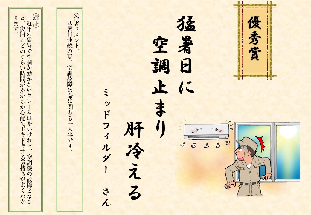 第6回建築設備あるある川柳コンテストには、354名のみなさまから計629句の力作をご応募いただき、まことにありがとうございました。建築設備は衛生性・安全性・機能性・快適性の向上に欠かせず、近年は気候変動への緩和や適応など、地球環境への貢献もますます重要となっています。空調・衛生・電気といった設備は建物に当たり前にあるため、日ごろは光があたりにくい存在ですが、川柳という形で、建築設備に新たな視点と注目を当ててくださったことに、心より感謝申し上げます。第6回となり「既出感」もありましたが、使用者のみならず、設計・施工・管理など働く人々の視点を捉えた作品が多く、新たな発見や世相も感じさせてくれました。「うがち」「軽み」「おかしみ」に加え、「設備感」「情感」「世相感」を意識して選考を行いました。今後も日常から設備の「あるある」に目を向けていただき、多くのご応募をお待ちしています。
